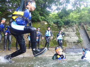 約1kmの川のコースを流されたり、飛び込んだりしながら進む冒険的プログラム!