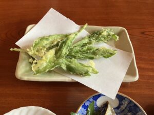 農作業後は間引いた若葉を天ぷらにしていただきます。