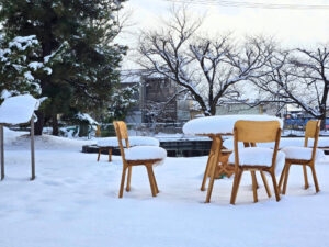 駐車場付近には、雪がこんもりと覆いかぶさった机と椅子が。
