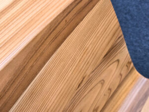 大胆に曲げても折れない秘訣は、木目の向きを交互に貼り合わせ、耐久性をあげること。