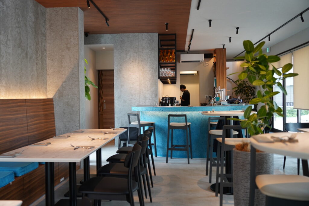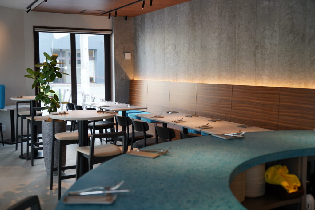 店内に入ると、爽やかなブルーを基調とした独創的なカウンター席と、ゆったりと配置されたテーブル席が広がります。